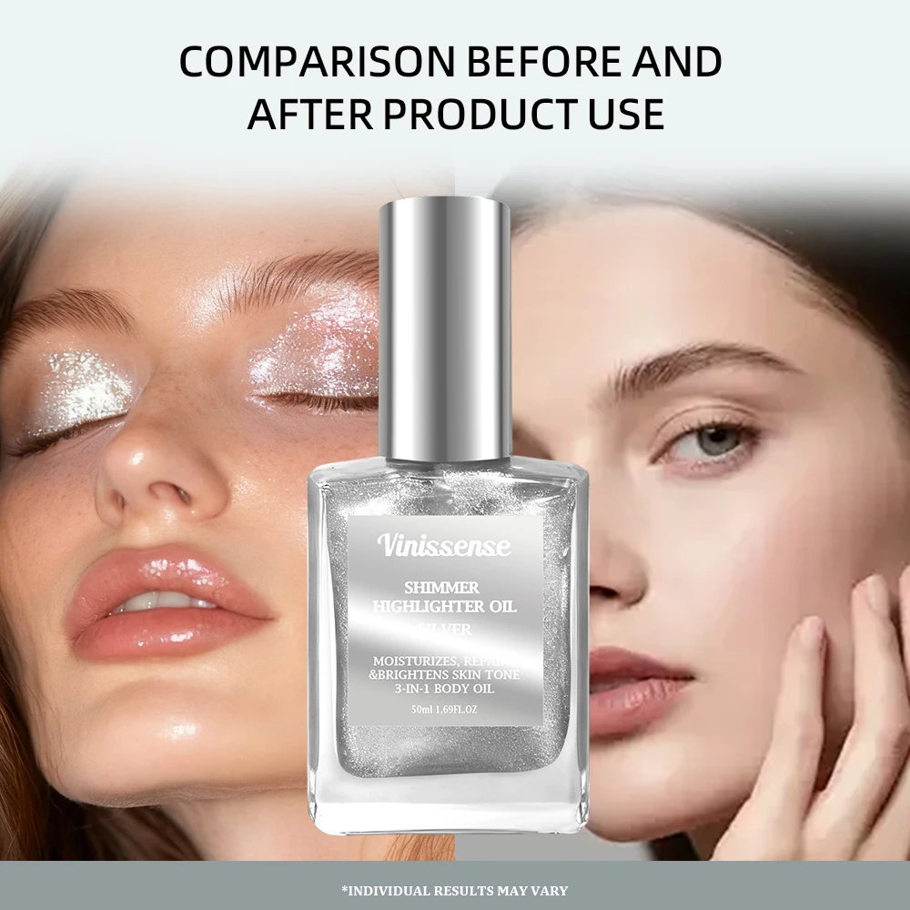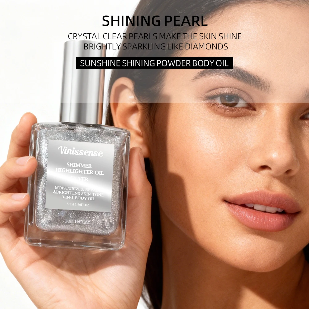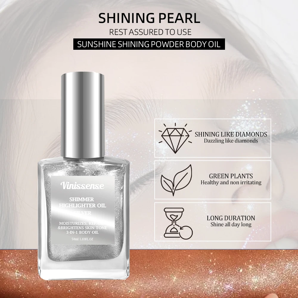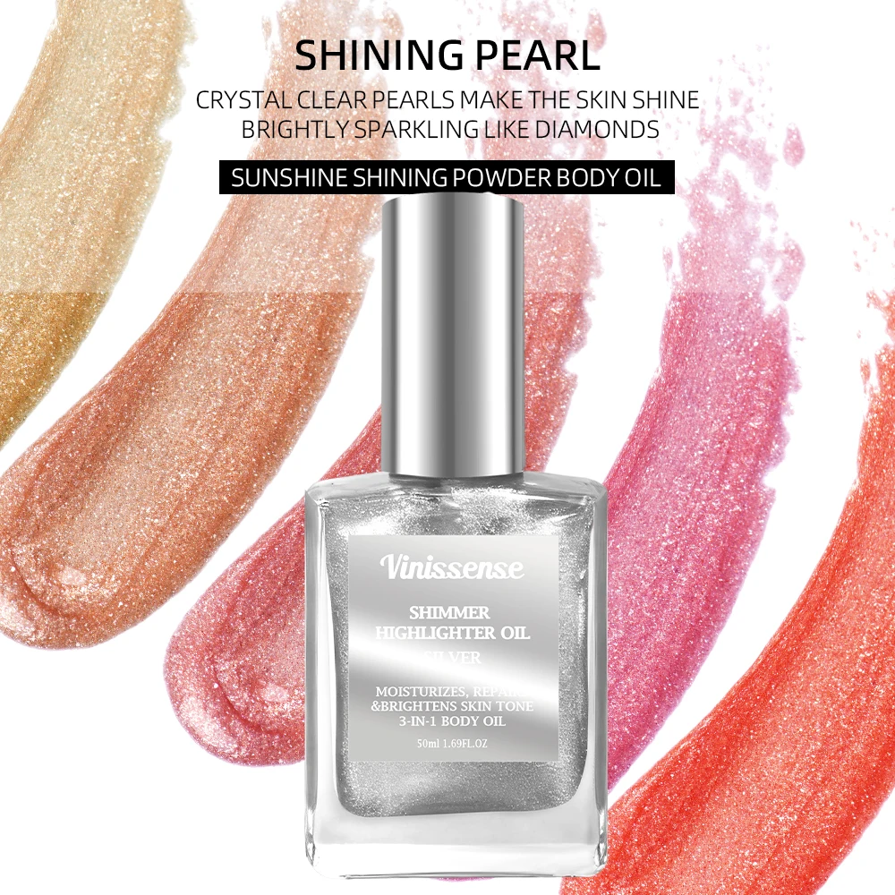 Wholesale Vegan Shimmer Oil Body Makeup Silver Rose Gold Bronze Skin Glow Glitter Highlighter Body Shimmer Oil for Women Silver